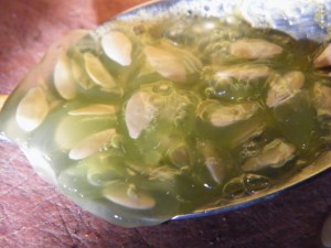 Evolutionarily, it’s ingenious. Practically, it’s a pain in the ass. You see, to enjoy said goo to its fullest, you need to spoon some out, put a little in your mouth, and try to just eat the goo without eating the seed. You sort of bite down on the tip of the seed to hold it in place and suck off the jelly-like casing. It’s not something you want to do in public. It’s messy, a little gross, and feels a little creepy, like you’re sucking on eyeballs or something. Okay, now that I’ve made you NEVER want to try one, I should put in the disclaimer – it’s the consistency of jello. If you like jello, you may not find this whole process that distasteful. I hate jello. It feels like I’m sucking on eyeballs. So there’s that.