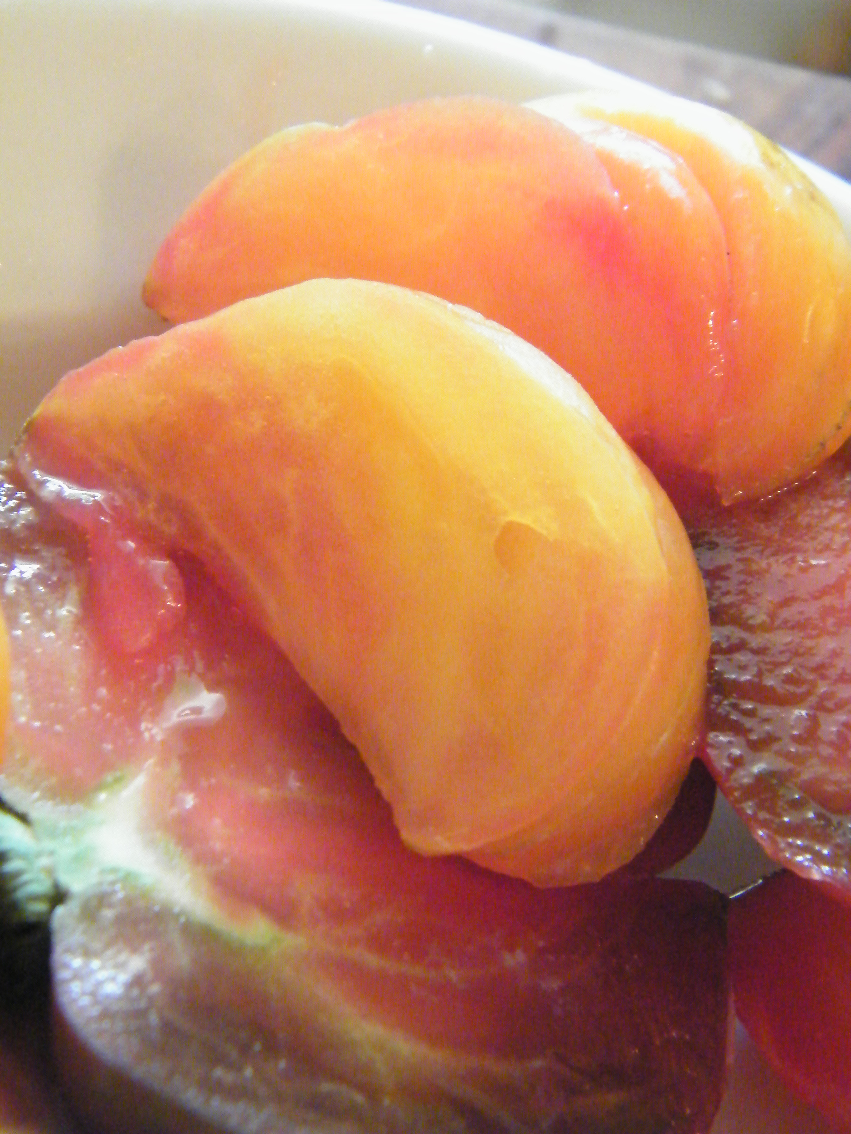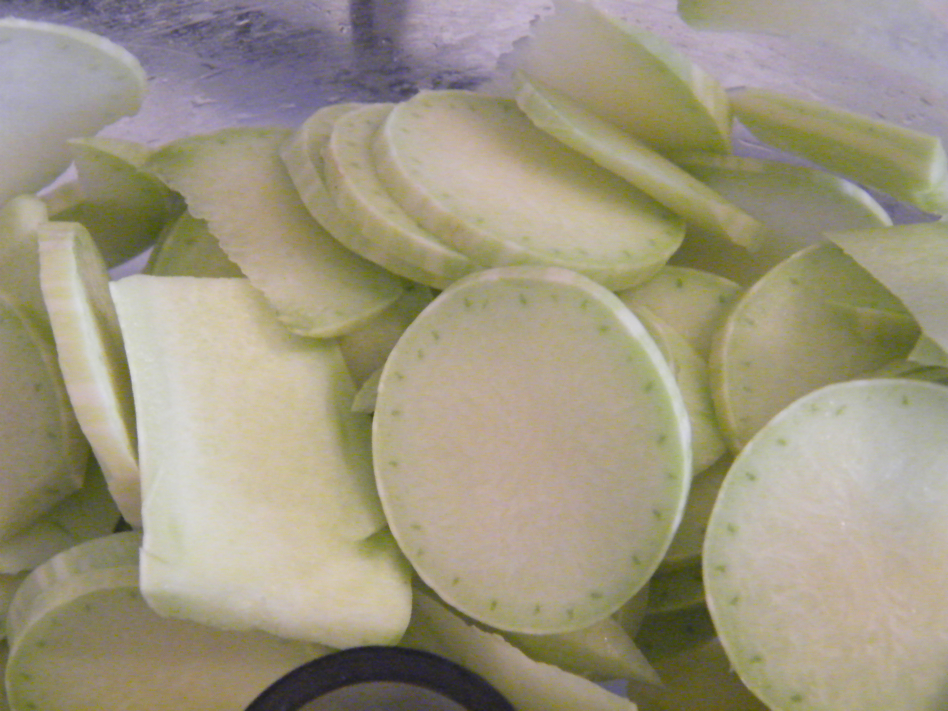 Like I said with the zucchini this year, I’m not wasting this puppy on “use it up” recipes, but you don’t need to. Zucchini is often easy to julienne or similar because of its straight shape; rampicante is easier to slice into rounds. If you have a food processor, chop the neck into straighter sections before putting through the slicing blade and you’ll have a gagillion Rampicante rounds in no time. If you put the bent part in, you’ll have long slices instead.