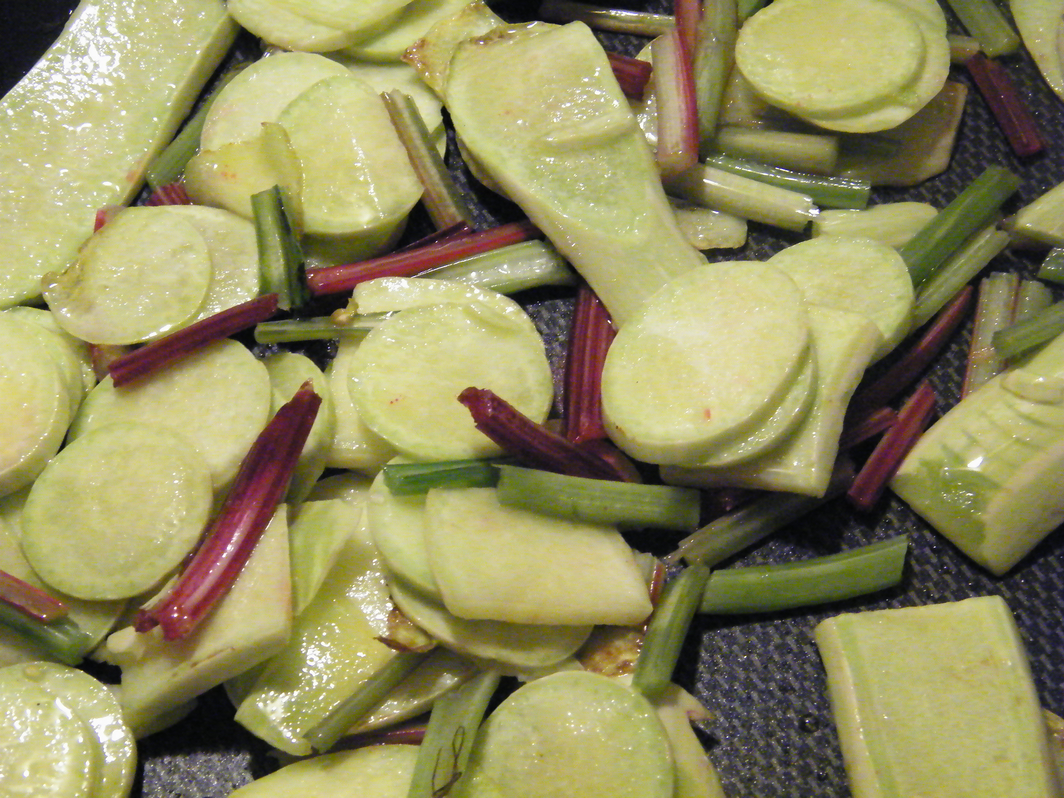Summer squashes have far more variety in flavor than one might expect, given that they’re always lumped into that same massive category. There’s crookneck and zucchini and patty pan and little stripey ones that the husband and I like to refer to as hand grenades… Rampicante is slightly sweet and slightly nutty. It’s most similar to zucchini in flavor, but a little nuttier. I don’t think it’s as mealy as crookneck, but sources differ on how to avoid the mealies with this guy: some say that the young ones start out quite mealy, others say that the younger/smaller fruits will always be the sweeter and more flavorful, so if you’re worried about mealiness, go with one of those. How to tell? They turn into a trombone as they grow, so shorter, straighter squash are what you would look for, though it’s possible to grow them straighter by trellising them, so again, look for short if you’re looking for young. This sucker is pretty full-grown, maybe 2 or 3 feet long if you stretched him out. Personally, I think the problem is steaming at any size. People are constantly telling me to steam squash because it’s so healthful that way, but to me, it tastes like mealy baby food. Not a fan of any kind of steamed squash, frankly.