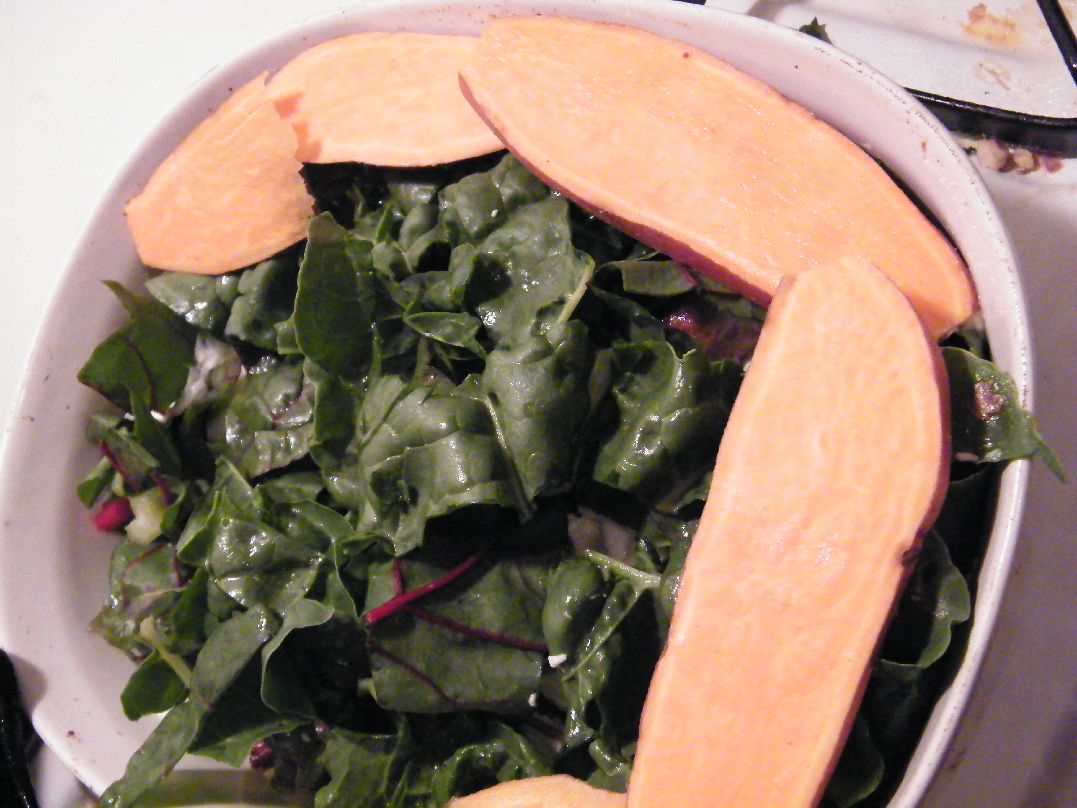 When the sausage is almost done, throw in the green parts of the beet greens – they cook fast, so now is the time to start stirring, adding a bit more olive oil if everything’s looking too dry. When the greens wilt,